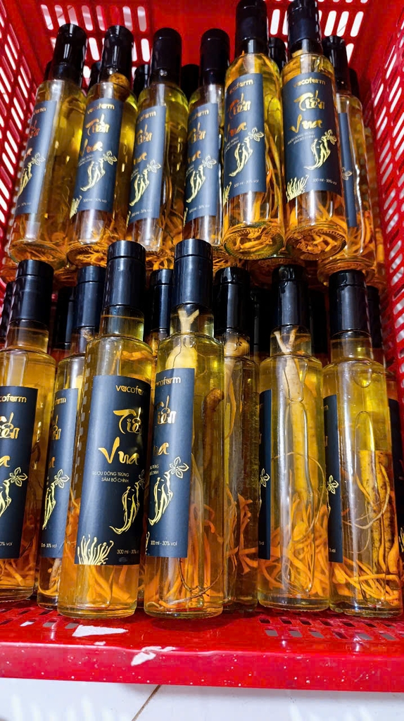 02 chai rượu Tiến Vua 300ml/chai– rượu ngâm Đông trùng hạ thảo với sâm bố chính (có sợi đông trùng hạ thảo và củ sâm trong chai rượu), được ngâm ủ trên 1 năm, hương vị đậm đà, hương thơm nồng nàn khó quên, giàu giá trị bồi bổ sức khỏe.