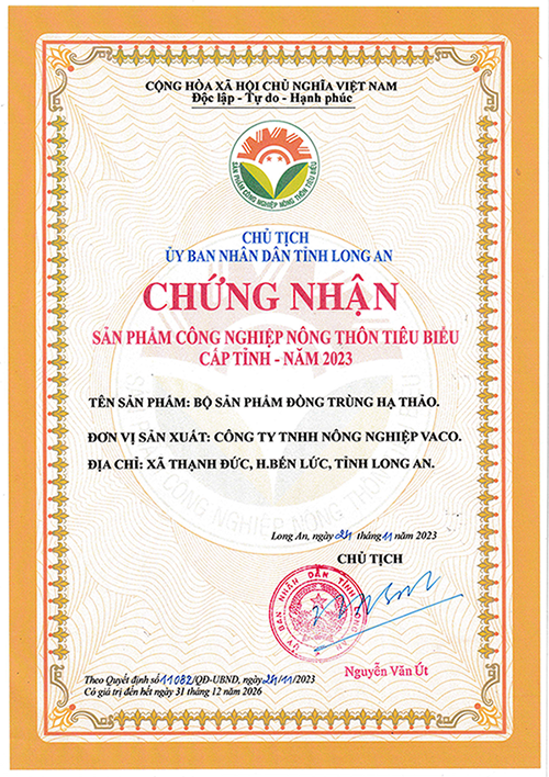 Bên cạnh đó, Công ty Vaco cũng vinh dự nhận được Giấy chứng nhận sản phẩm OCOP 4 sao cho các dòng sản phẩm nấm đông trùng hạ thảo tươi và khô, do Ủy ban Nhân dân tỉnh Long An cấp năm 2023, khẳng định sản phẩm nấm đông trùng hạ thảo của công ty đáp ứng các tiêu chí nghiêm ngặt về chất lượng và giá trị kinh tế, văn hóa. Những chứng nhận này không chỉ là niềm tự hào mà còn là động lực để Vaco tiếp tục phát triển, mang đến những sản phẩm tốt nhất cho người tiêu dùng, góp phần nâng cao uy tín của nông sản Việt Nam trên thị trường trong và ngoài nước.